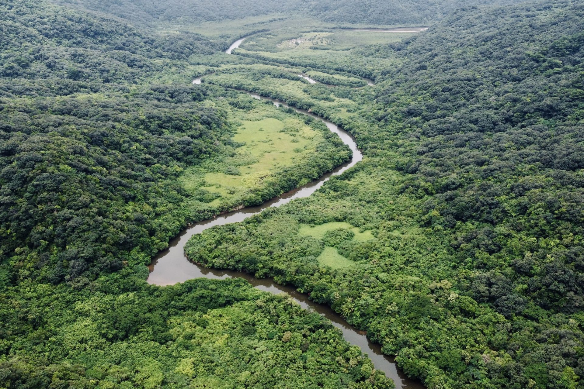 河口から川沿いに広がるマングローブ、だんだんと細くなる川幅、植生が変わる植物たち。
